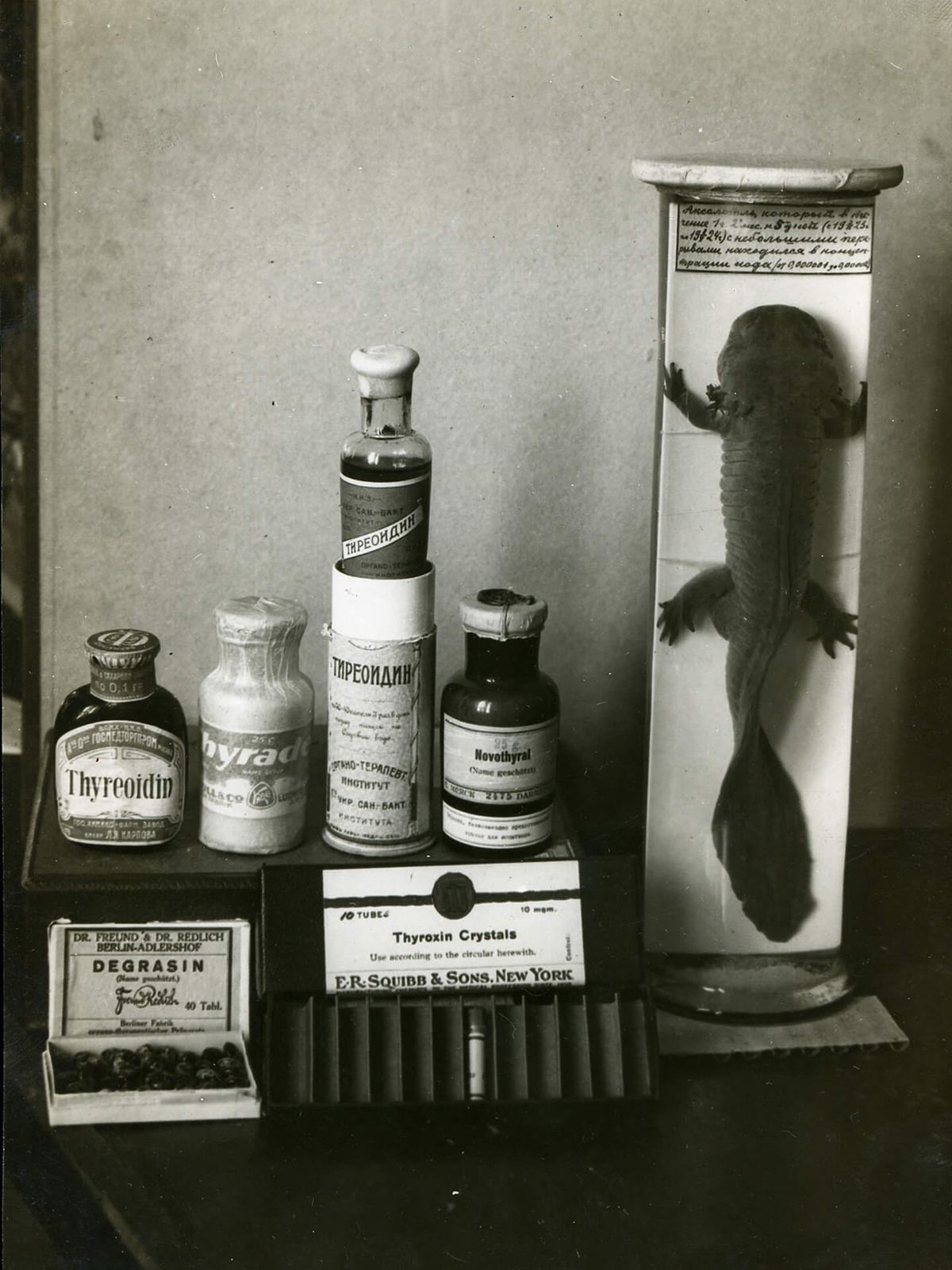 Опыты с аксолотлями подтвердили значение тиреоидного гормона щитовидной железы для достижения половой зрелости и перехода от дыхания жабрами к наземной форме существования. Аксолотль-личиночная форма мексиканской амблистомы. Для ускорения ее превращения в половозрелую особь применяли раствор сухого порошка щитовидной железы в разных концентрациях. Такие же опыты проводили с головастиками, ускоряя их превращение в лягушек.