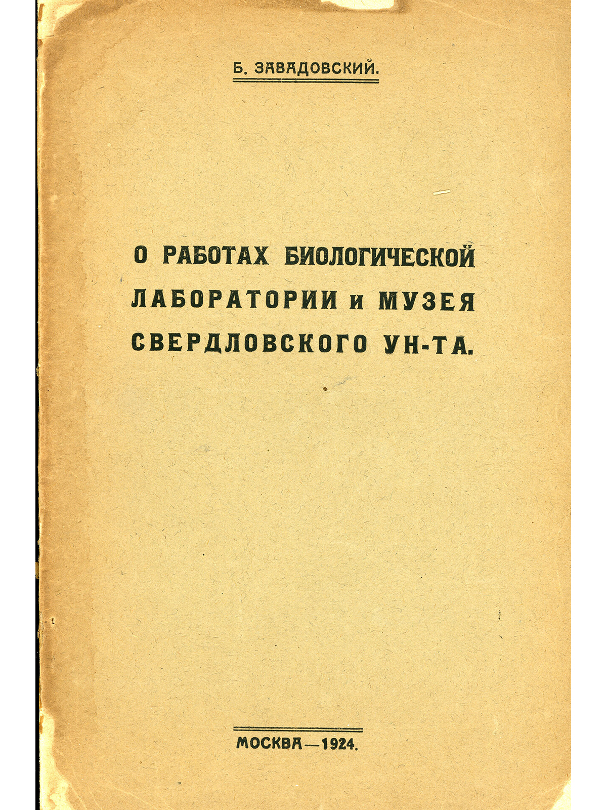 Лаборатория при кафедре биологии Свердловского Комуниверситета стала плацдармом для проведения экспериментов в области условных рефлексов и эндокринологии Завадовским и его учениками. Сохранились учебные таблицы, программы ведения занятий и лабораторных работ, записи опытов на собаках, аксолотлях и курах.