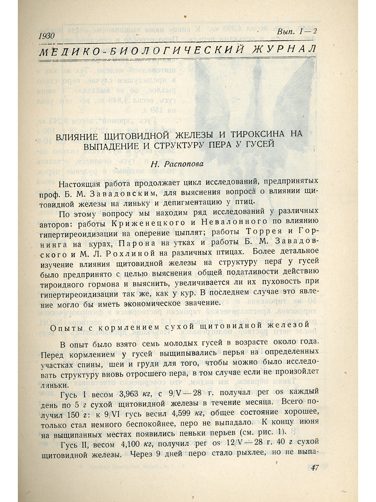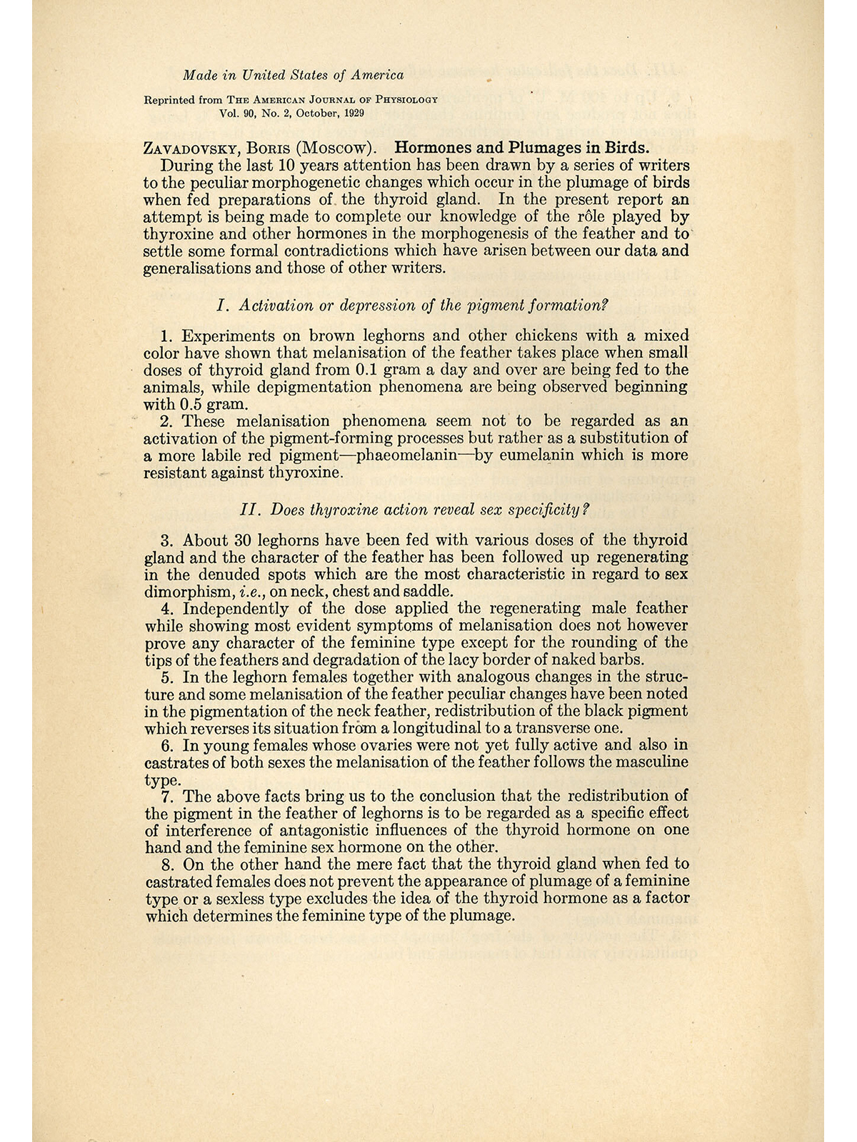 По опытам гипертиреодизма у кур (кормления их щитовидной железой) наблюдался эффект частичного или полного выпадения оперения. Затем оперение восстанавливалось, но с другим пигментом или частично депигментированное. Это было важно для промышленности, так как перо использовали для набивки подушек и одеял. Под влиянием опытов Завадовского его ученики стали проводить эксперименты с другими видами птиц, домашних и диких.