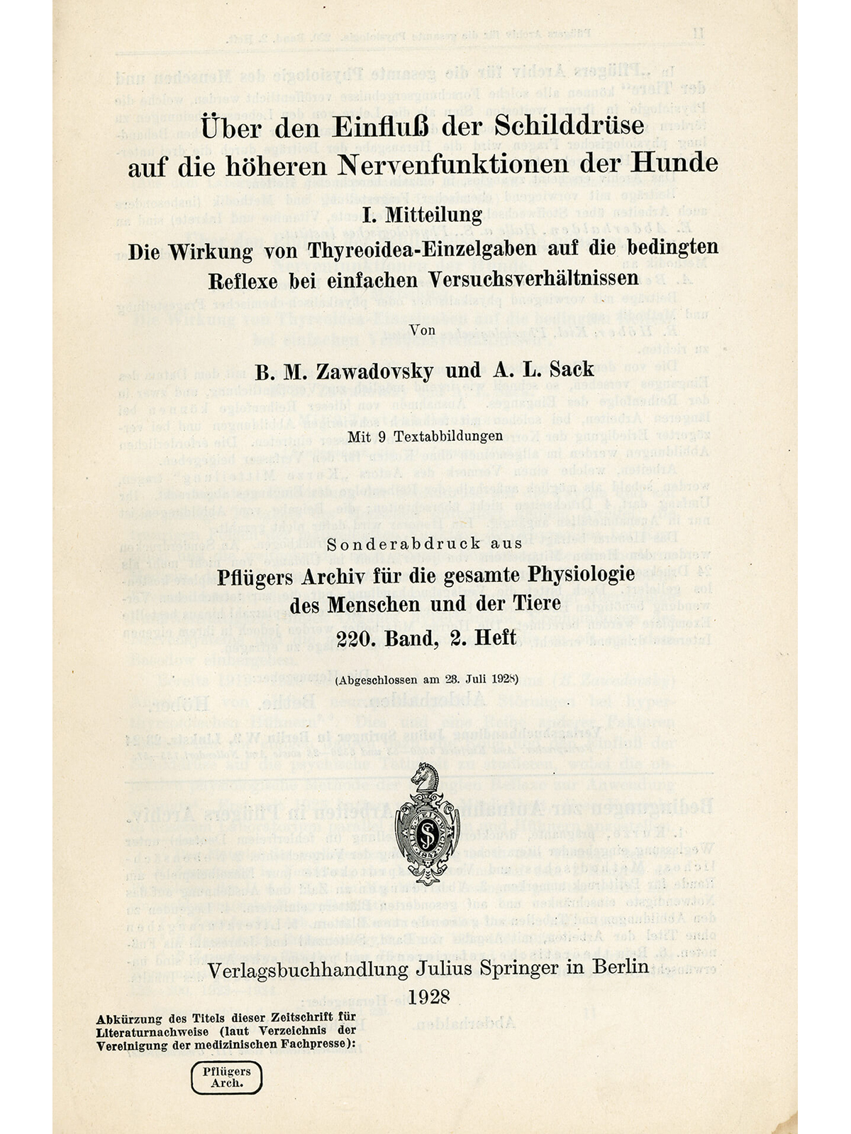Завадовский Б.М., Зак А.Л. «К вопросу о влиянии щитовидной железы на высшую нервную деятельность собак» Сообщение 1-е: влияние разовых доз щитовидной железы на условные рефлексы в простых условиях опыта, Берлин, 1928 г.