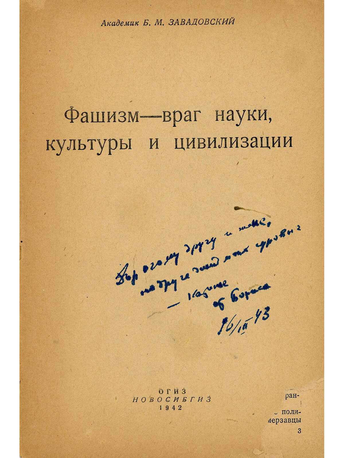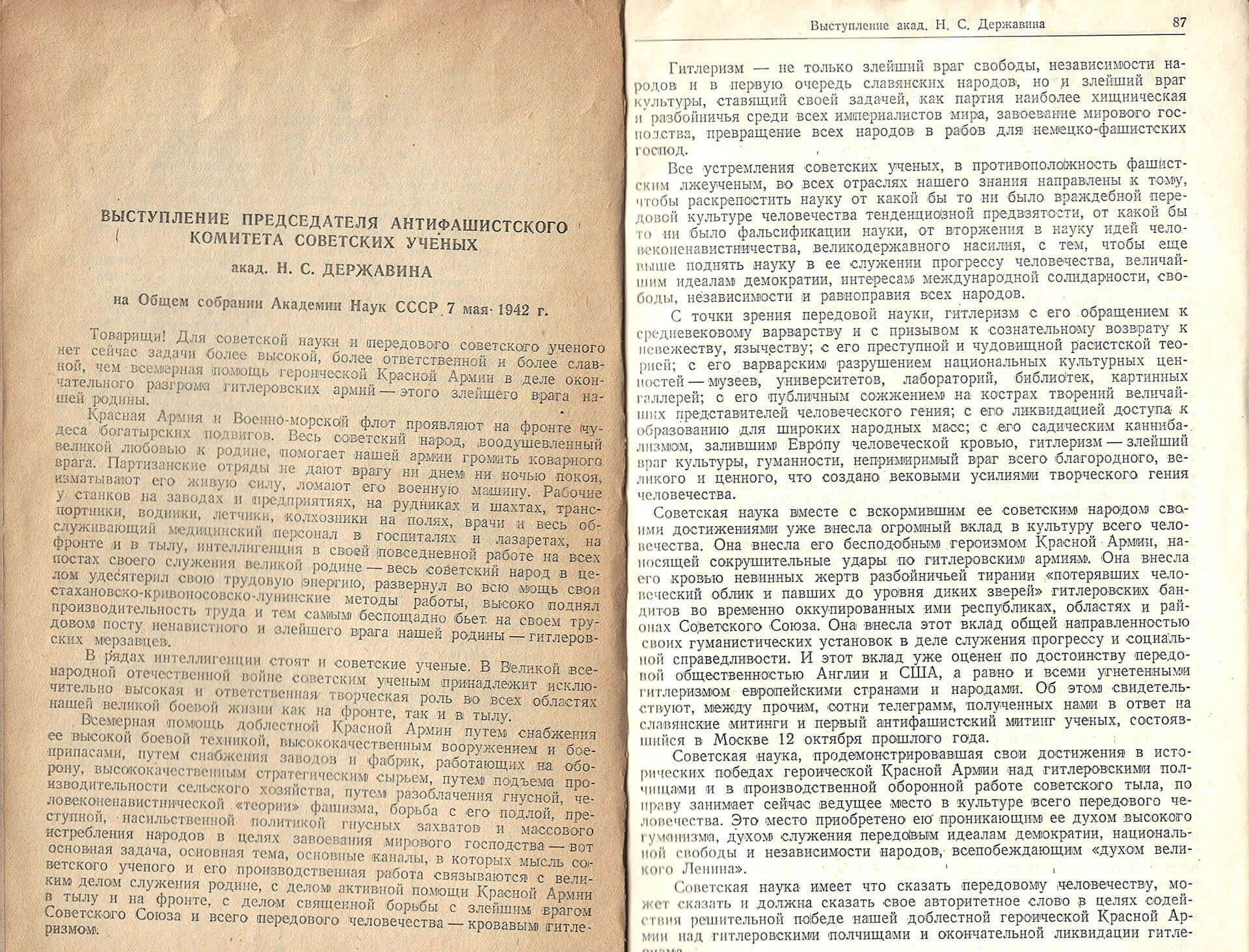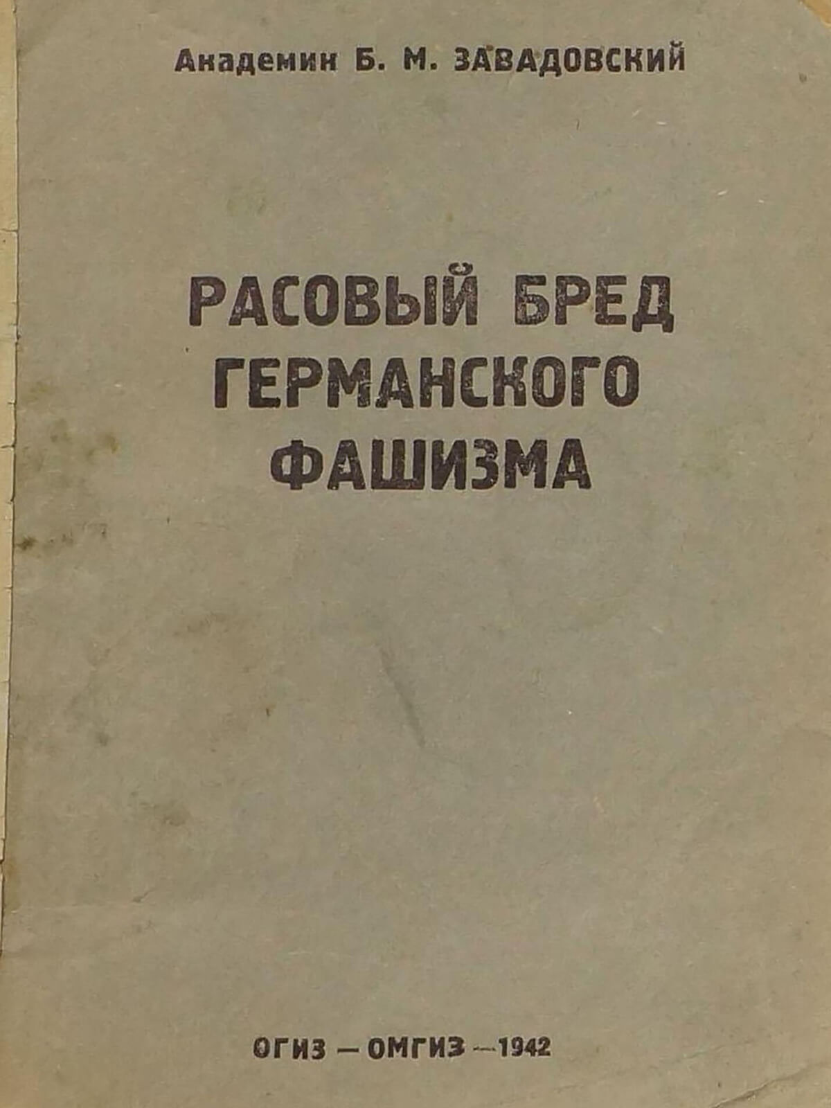 В своем выступлении академик Державин призывает создавать публикации «разоблачающие злейший человеконенавистнический характер фашистских теорий». Борис Михайлович Завадовский откликнулся на его призыв изданием двух книг: «Расовый бред германского фашизма» и «Фашизм-враг науки, культуры и цивилизации».