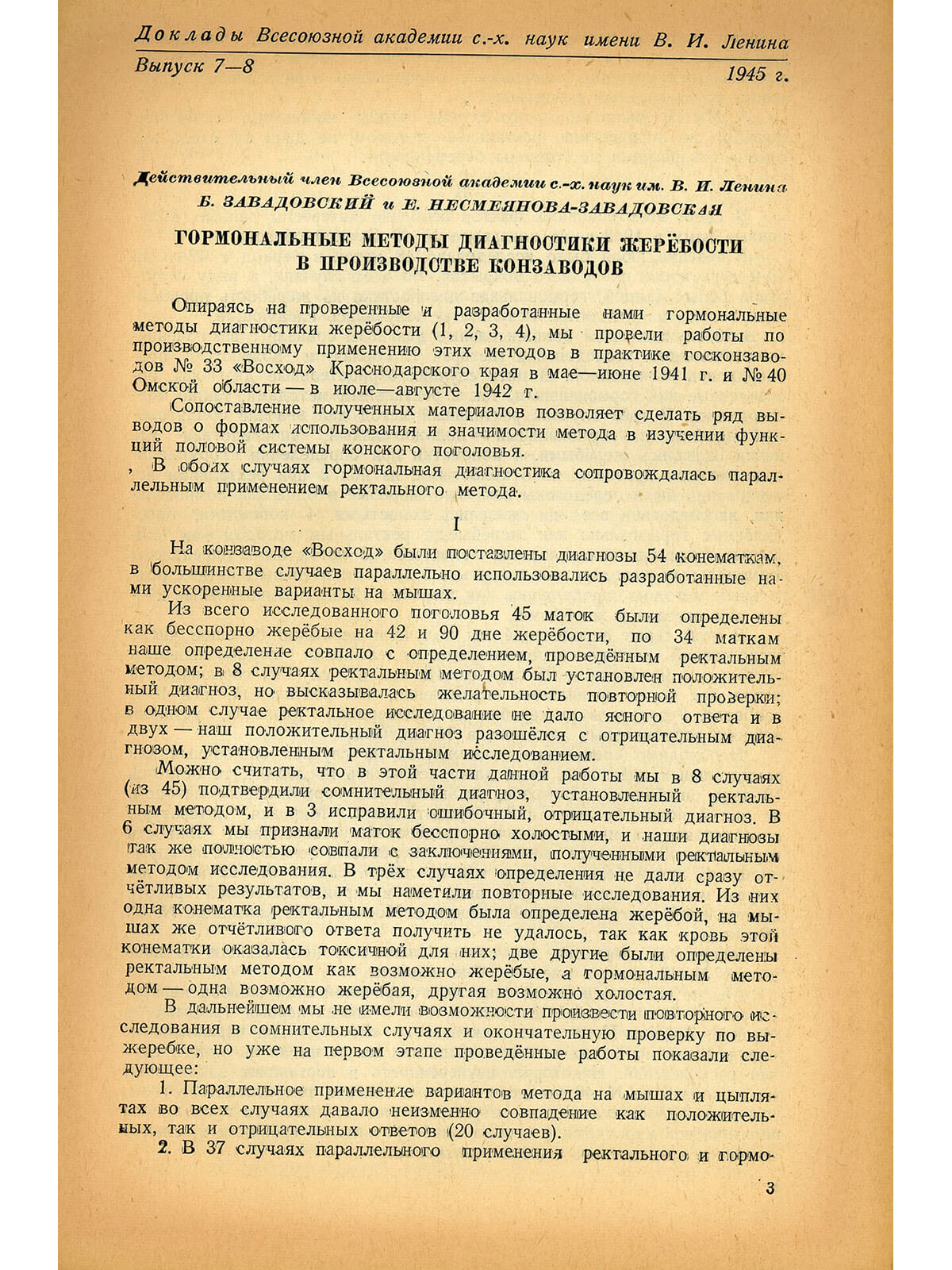 В эвакуации Борис Михайлович Завадовский провел ряд экспериментальных работ в совхозах Омской области: «Пятилетка», «Лузино» и №40. Работы велись на конзаводах, свинофермах и с крупным рогатым скотом. В архиве хранятся таблицы с результатами определения беременности конематок с 1941 по 1945 гг., причем не только в Омской области, но и на конзаводе «Восход» (Краснодарский край) и конзаводе «Троицкий» (Челябинская область). С 1935 года Е.Г. Несмеянова-Завадовская выступала в качестве соавтора в некоторых научных исследованиях Б.М.Завадовского.